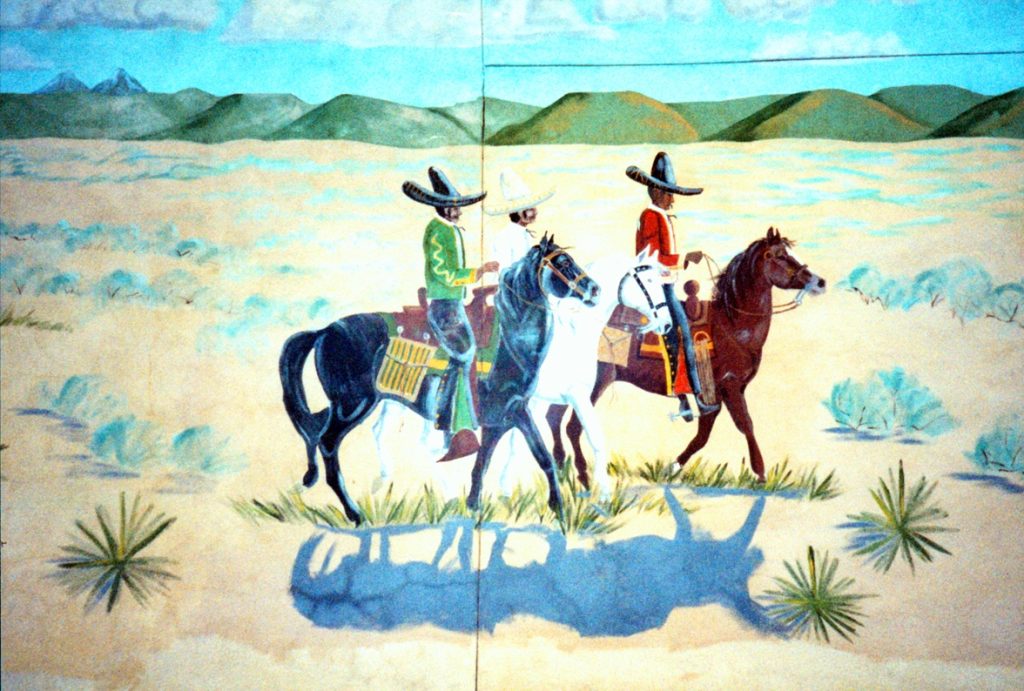 De vaquero verslaat de Amerikaanse cowboy in vele opzichten op punten. Zo zijn de mannen van south of the border – in talloze westerns althans – meedogenlozer, gemener. Maar de vaquero valt toch vooral op door een surplus aan stijl. De laarzen hebben scherpere punten en schuinere hakken. De wapperende broekspijpen zijn opzichtig versierd en de korte jasjes al even kleurrijk. En de sombrero is opvallender dan de Stetson en vele malen groter bovendien. En zie deze drie trotse Mexicanen eens rechtop zitten op hun paarden. Het tafereel is te bewonderen op een van de vele muurschilderingen in Las Animas, een stadje in Colorado.